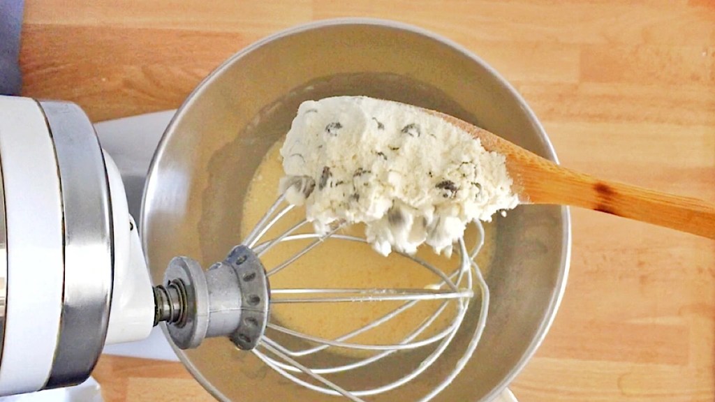 - Malzemeleri birleştir…..Yumurta karışımına yavaş yavaş karıştırılarak un karışımı eklenir.Tahta kaşıkla yavaşça alt üst yaparak karıştırın.