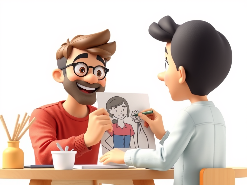 Mamá, estoy dibujando tu retrato para ti con mi papá.