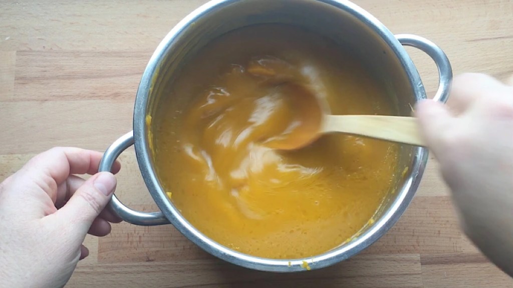 - Karıştırdığınız çorbayı ….küçük bir kaba koyduğunuz 100 g. kremaya kaşık kaşık ekleyip çırpma teliyle çırpın. Hepsini tenceye geri koyun. Pişirin.